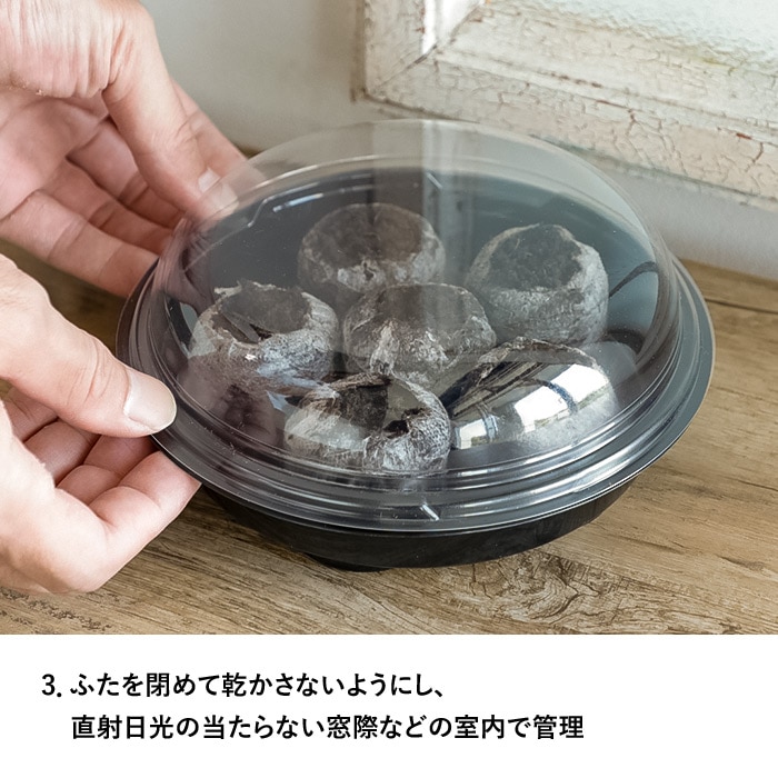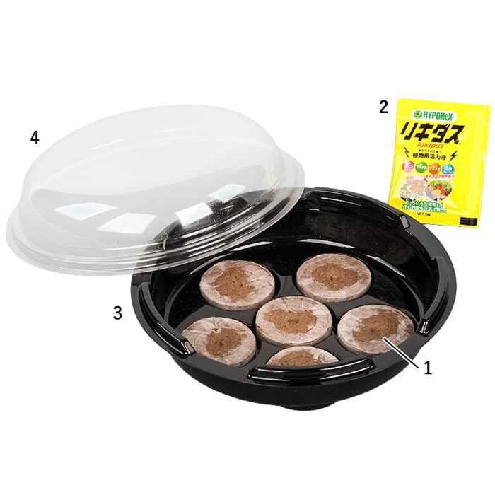 1:ジフィーセブン、2:活力剤(リキダス)、3:栽培トレー、4:栽培ドーム