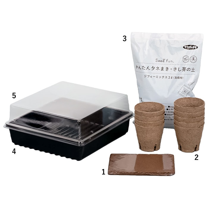1:ピートバン、2:ジフィーポット、3:ジフィーミックス、4:ハーフトレーベース、5:ハーフトレードーム
