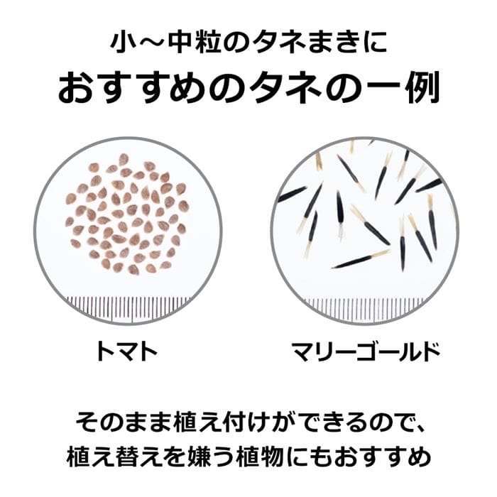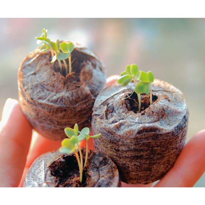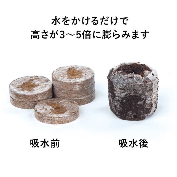 中央のくぼみにタネをまき、芽が出たらそのまま植え付けができます。自然素材のピートを主原料にし初期肥料も配合済みです。