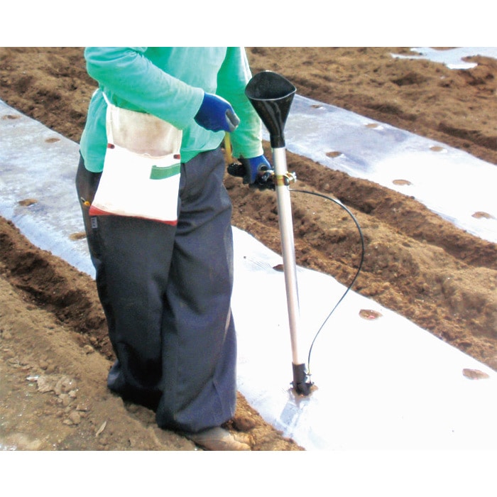 タネを入れてレバーを引くだけでタネまきができます。立ったままタネまきができる優れもので、ラッカセイやエダマメ、スイートコーンのタネまきにおすすめです。