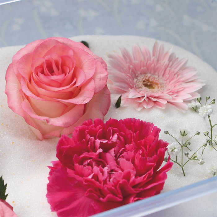 お花に優しいパウダータイプのシリカゲルで、お花の色と形をきれいに残せます。