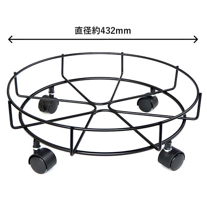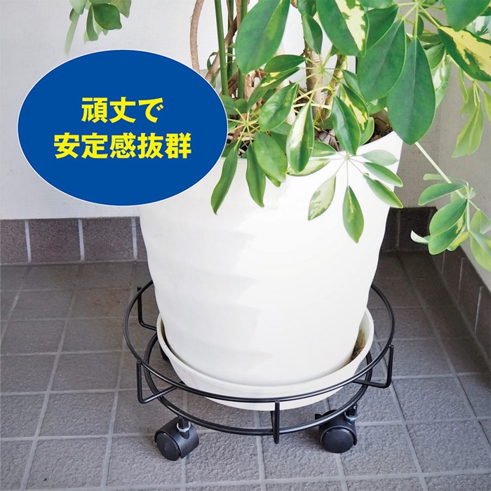 観葉植物などを室内やベランダで楽しむとき、大きい重い鉢植えは、つい床に置きっ放しにしていませんか。室内では時々向きを変え、移動することで偏り成長を抑え、植物本来の姿、色彩を保つことができます。頑丈な極太線仕上げで安全安心。キャスター付きですから10号鉢までらくらく移動できます。