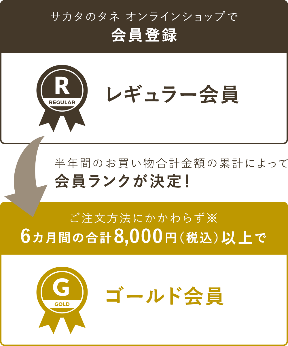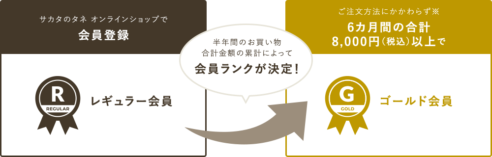 ご注文方法にかかわらず(オンラインショップ・ハガキ・FAX)6カ月間のお買い物合計金額が8,000円(税込)以上のお客様が、翌1年間のゴールド会員となります。