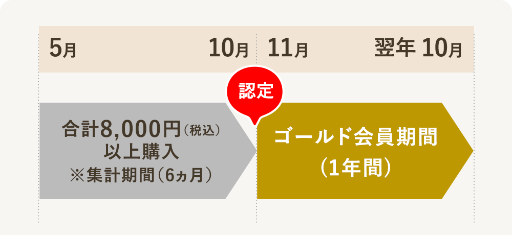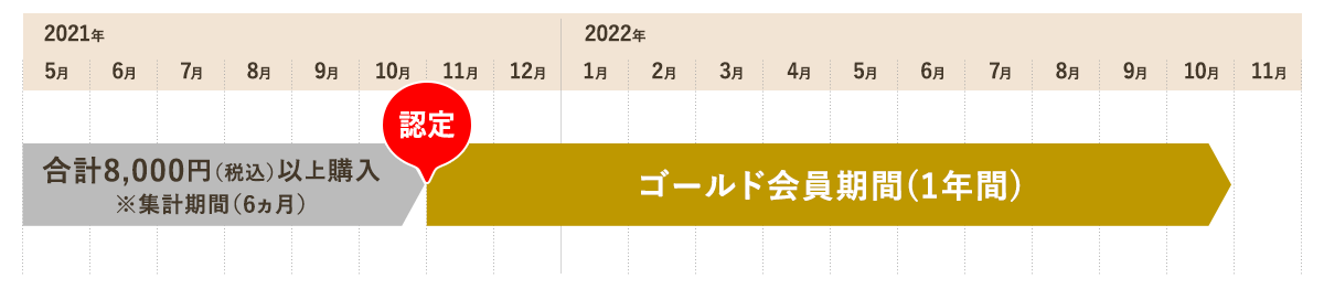 例)2021年5~10月に8,000円(税込)以上購入すると、2021年11月~2022年10月末の期間、ゴールド会員に認定されます。