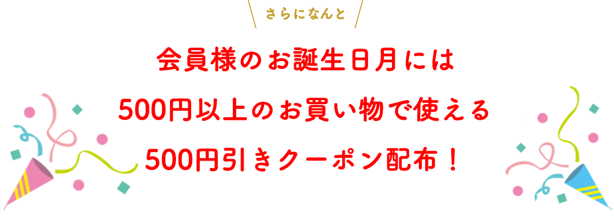 | お誕生日クーポン※会員割引後の価格が500円以上で クーポンをご使用になれます。 ※クーポンをご利用いただくには、 メールマガジンのご登録が必要です。 |