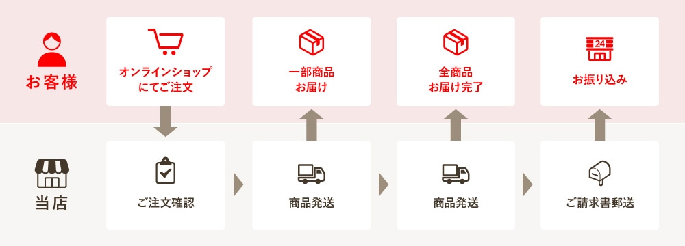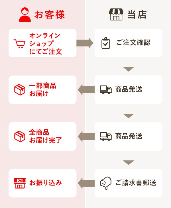 全商品(1回のご注文分)の発送が完了した後、10日前後に「請求書」を郵送いたします。