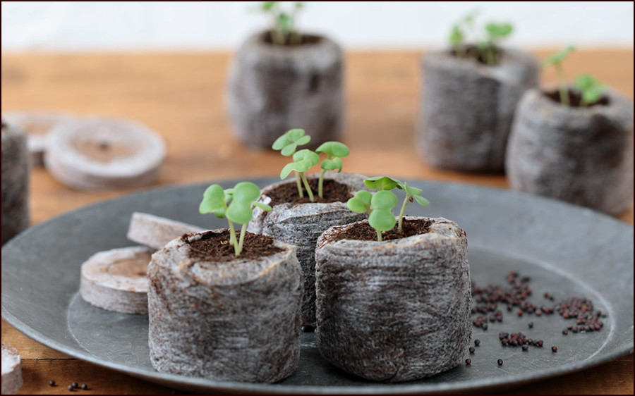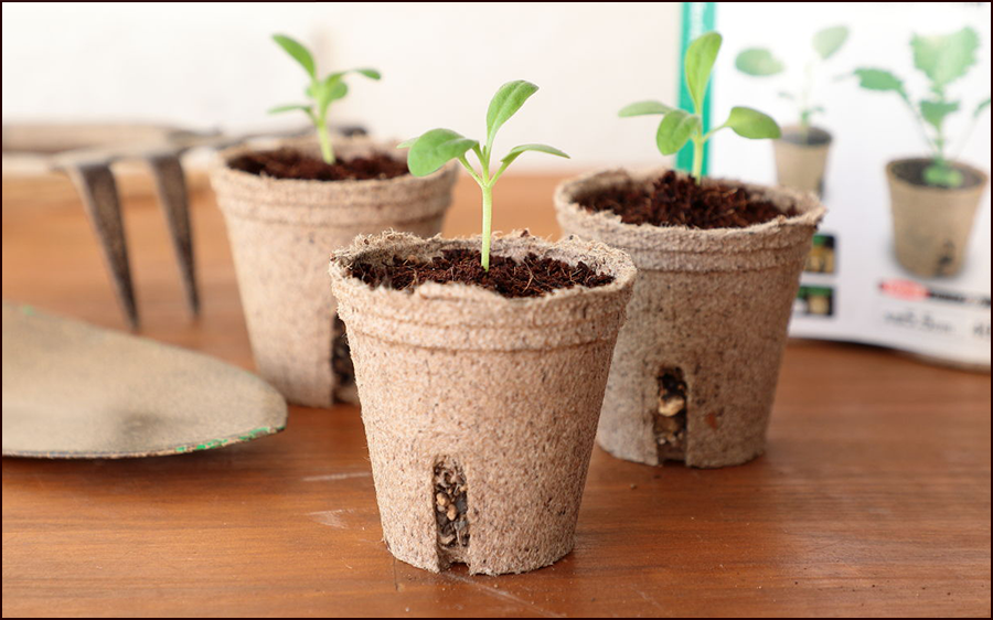 吸水させるだけで培養土ポットに。中央のくぼみ部分に種をまき、芽が出たらそのまま定植できます。
