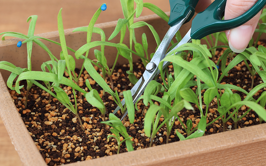 まず、種を少し多めにまいて混み合った状態で発芽させて競争を促します。芽が出たあとは、かわいそうな気もしますが、間引いていきます。実は、この間引くのも大切な作業です。なぜなら、株が混み合っていると風通しが悪くなり、病害虫が発生しやすくなってしまうからです。
