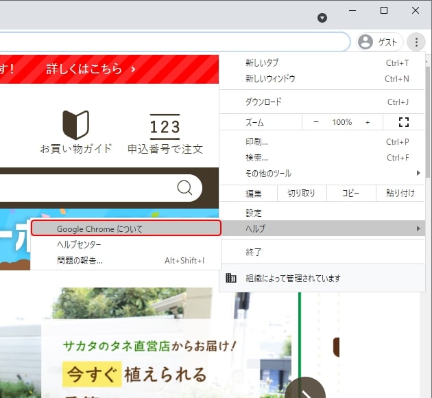 2. デフォルトでは右上の三点マーク(またはスパナマークのアイコン)をクリックします。表示されたメニュー、ヘルプの中の「Google Chromeについて」をクリックします。