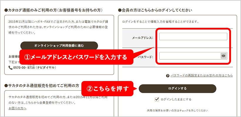 過去にハガキ・FAXでご注文された方、または電話でカタログ請求のみご利用された方は、オンラインショップご利用のために必要情報のご登録を行ってください。